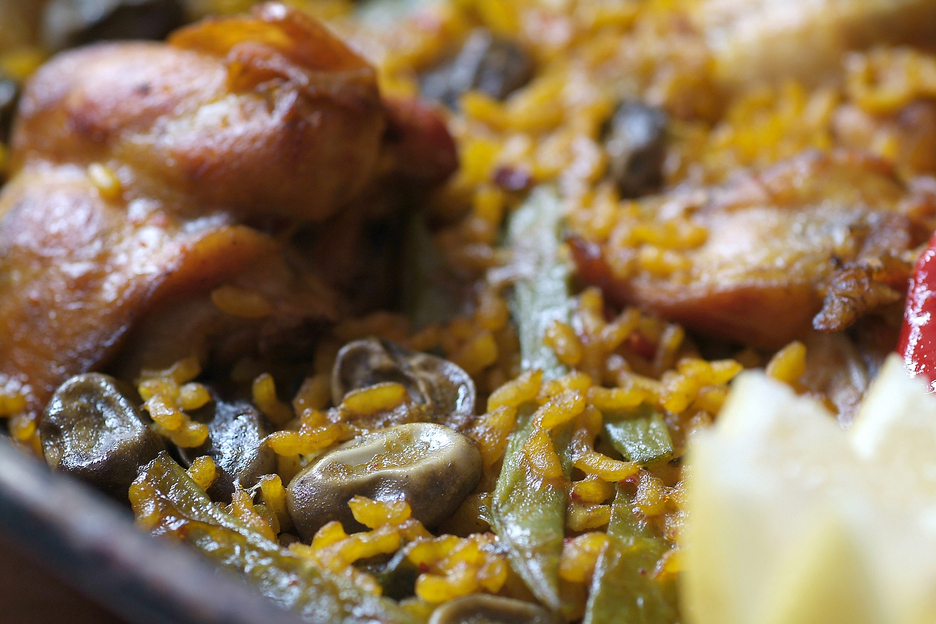 Restliches Gemüse reinigen und stückeln, in einer Paellapfanne mit dem Reis und Schweinefleisch anbraten.